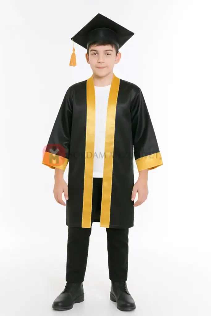 - Bedeni siyah saten kumaş, kollar ve ön bantları altın sarısı klasik model cübbe