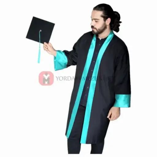 - Bedeni siyah alpaka kumaş, kollar ve ön bantları turkuaz saten, klasik model cübbe